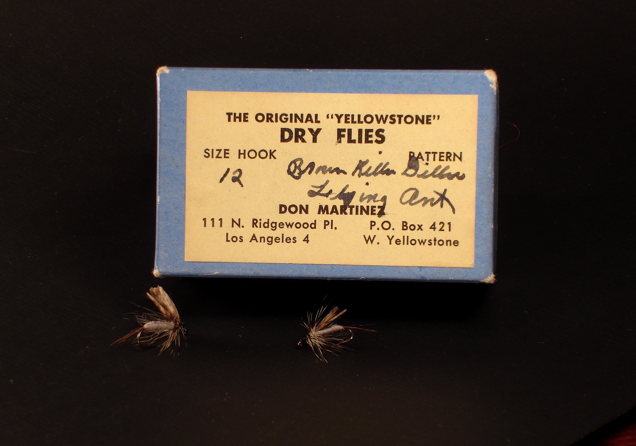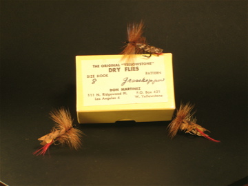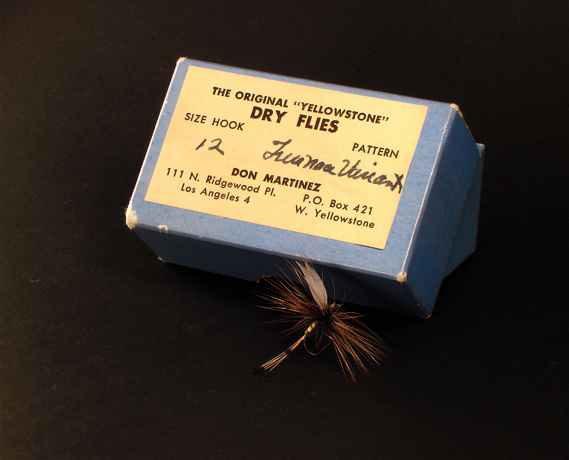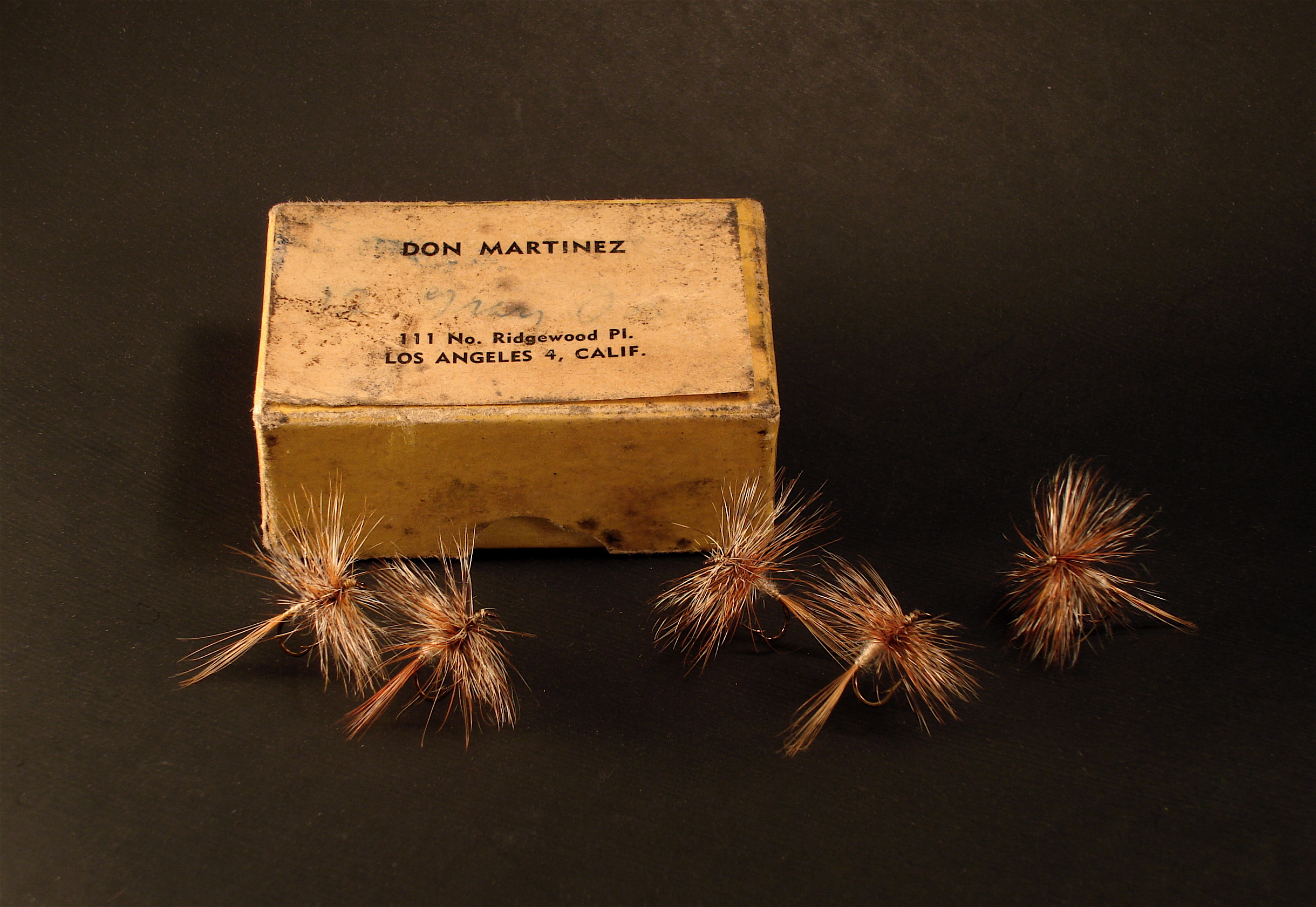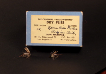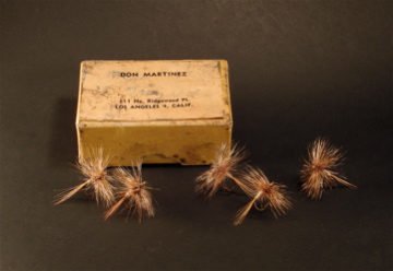 As you will note on his blue and yellow fly boxes below, Martinez lived in Los Angeles during the winter and in the spring he returned to West Yellowstone, Montana to operate this one room fly shop and fish the waters he loved. Martinez flies are some of the most difficult flies to acquire given Don Martinez passed away at an early age in the 1950s.
