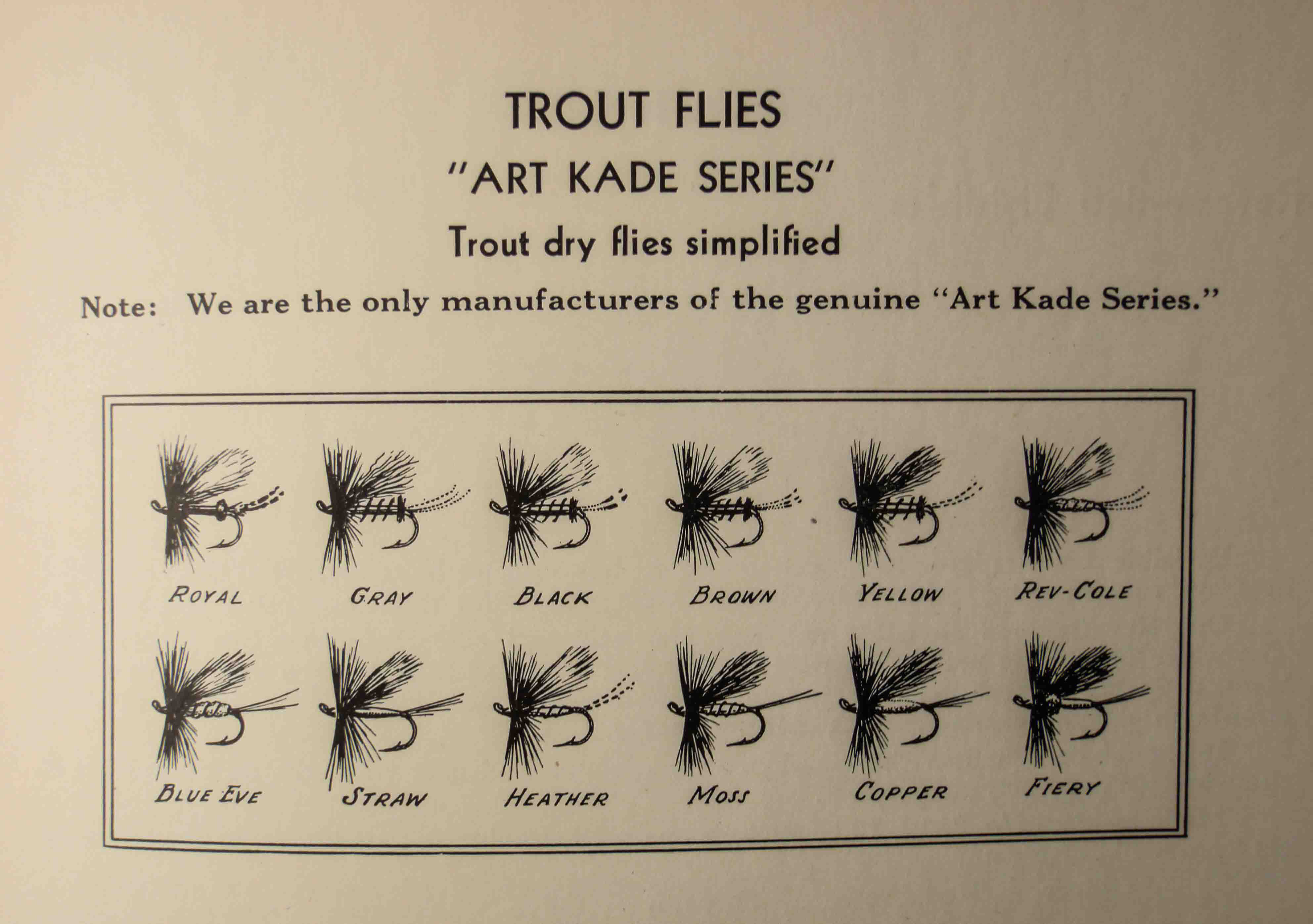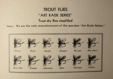 Art Kade Flies are "Made in America"...all in our own shop. They are not "production line gadgets" knocked out to sell at a price but are created with the utmost care for discriminating anglers who appreciate a truly fine fly. Our own expert fly tiers are not only artists in fly dressing but each is a proficient fly fisherman as well-who analyzes the handling and fish attracting qualities of our flies and tests their durability at the streamside in actual use.