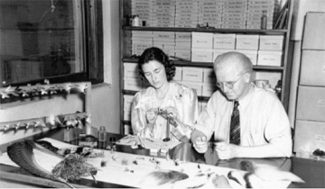 Helen Shaw tying with Art Kade, 20 June 1942. As a young woman that she met and was hired by Art Kade, owner of Art kade Flycrafters. The inside of his catalog read "Art Kade Flycrafters, Designers and Manufactures of Fine Fishing Flies." Kade's catalogue announced: